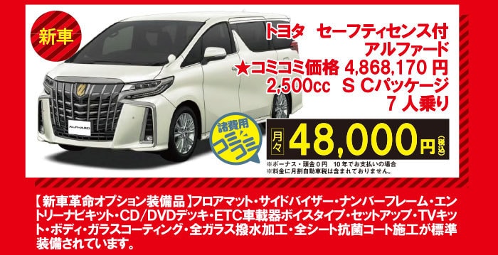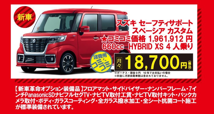 | ご購入のご確認について | ■ご購入確認 お買い物カゴよりご購入頂いた場合,後ほど当社よりメールまたはお電話にてご連絡させて頂きます。ご注文後一週間メールでのご連絡がとれない場合,ご注文をキャンセル とさせて頂きますので予め御了承下さい。 ※ご注文内容の確認は、必ずお電話でご確認をさせて頂きますのでご了承下さい(車種・グレード・ボディーカラー・オプションなどの確認) ■お買い物かごの価格について 【総額価格表示推奨店】新車革命.COMではお客様にわかり易く価格を総額表示させて頂いております。 お買い物かごの価格は総額表示となっております。 ※上記価格に含まれていない費用は以下を参照下さい 月割り自動車税(軽自動車はかかりません) ※販売価格は予告なく変更する場合がございます ※新車のモデルの変更などにより販売出来ない車両もございますのでご了承くださいませ ※下取り車のクーポン付与は、下取り車査定が付けれないお車には付与出来ませんのでご了承ください。 |