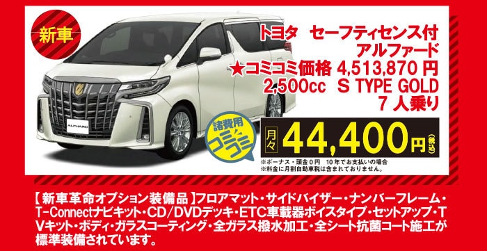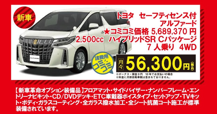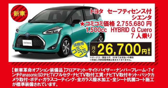 | ご購入のご確認について | ■ご購入確認 お買い物カゴよりご購入頂いた場合,後ほど当社よりメールまたはお電話にてご連絡させて頂きます。ご注文後一週間メールでのご連絡がとれない場合,ご注文をキャンセル とさせて頂きますので予め御了承下さい。 ※ご注文内容の確認は、必ずお電話でご確認をさせて頂きますのでご了承下さい(車種・グレード・ボディーカラー・オプションなどの確認) ■お買い物かごの価格について 【総額価格表示推奨店】新車革命.COMではお客様にわかり易く価格を総額表示させて頂いております。 お買い物かごの価格は総額表示となっております。 ※上記価格に含まれていない費用は以下を参照下さい 月割り自動車税(軽自動車はかかりません) ※販売価格は予告なく変更する場合がございます ※新車のモデルの変更などにより販売出来ない車両もございますのでご了承くださいませ ※下取り車のクーポン付与は、下取り車査定が付けれないお車には付与出来ませんのでご了承ください。 |