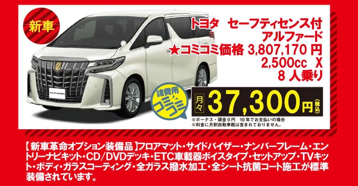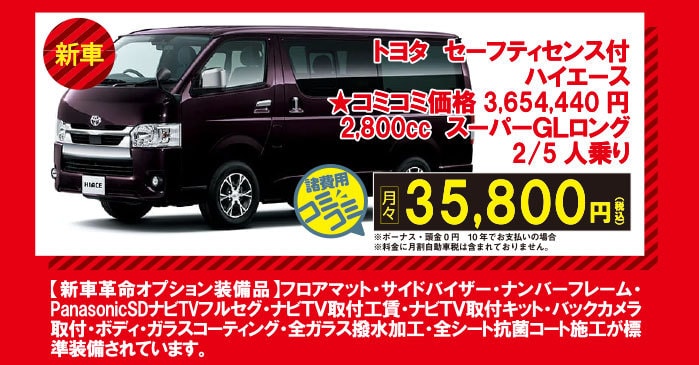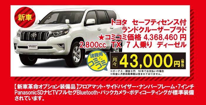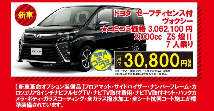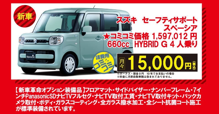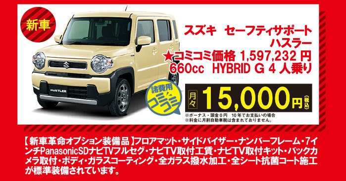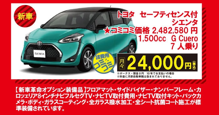 | ご購入のご確認について | ■ご購入確認 お買い物カゴよりご購入頂いた場合,後ほど当社よりメールまたはお電話にてご連絡させて頂きます。ご注文後一週間メールでのご連絡がとれない場合,ご注文をキャンセル とさせて頂きますので予め御了承下さい。 ※ご注文内容の確認は、必ずお電話でご確認をさせて頂きますのでご了承下さい(車種・グレード・ボディーカラー・オプションなどの確認) ■お買い物かごの価格について 【総額価格表示推奨店】新車革命.COMではお客様にわかり易く価格を総額表示させて頂いております。 お買い物かごの価格は総額表示となっております。 ※上記価格に含まれていない費用は以下を参照下さい 月割り自動車税(軽自動車はかかりません) ※販売価格は予告なく変更する場合がございます ※新車のモデルの変更などにより販売出来ない車両もございますのでご了承くださいませ ※下取り車のクーポン付与は、下取り車査定が付けれないお車には付与出来ませんのでご了承ください。 |